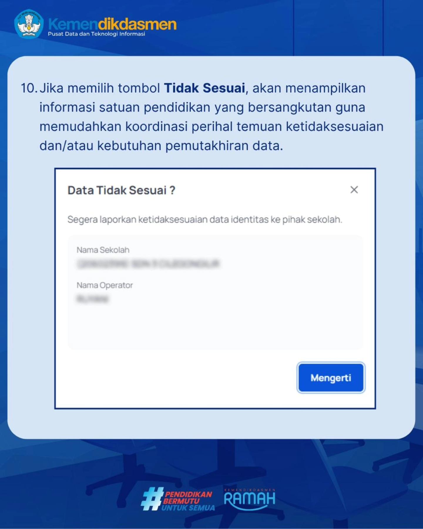 Jika data tidak sesuai, segera koordinasikan dengan Operator Sekolah agar dapat segera diperbaiki.